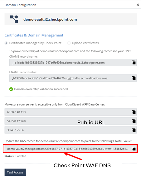 Once the asset has been created the WAF will provides a **WAF DNS endpoint** (e.g., `xxxx.checkpoint.com`).